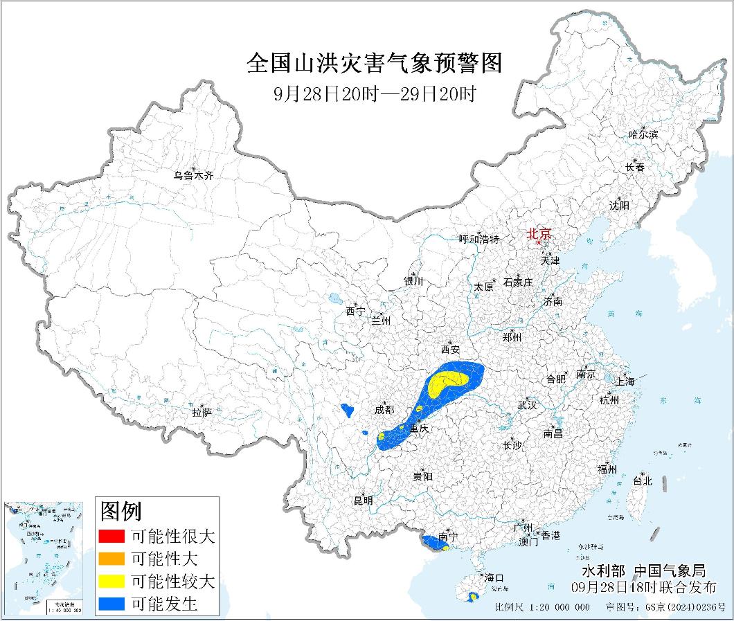 预计,9月28日20时至9月29日20时,湖北西部、广西南部、海南南部、四川东部和中部、重庆北部和西部、云南东北部、陕西南部等地部分地区可能发生山洪灾害(蓝色预警),其中,湖北西部、广西南部、海南南部、四川东部、重庆北部和西部、云南东北部、陕西南部局地发生山洪灾害可能性较大(黄色预警)。其他地区也可能因局地短历时强降水引发山洪灾害,请各地注意做好实时监测、防汛预警和转移避险等防范工作。