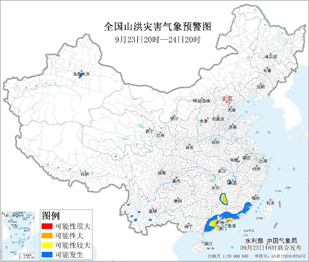 预计,9月23日20时至9月24日20时,江西西南部、广东南部等地部分地区发生山洪灾害可能性大(橙色预警),其中,广东南部局地发生山洪灾害可能性很大(红色预警)。其他地区也可能因局地短历时强降水引发山洪灾害,请各地注意做好实时监测、防汛预警和转移避险等防范工作。